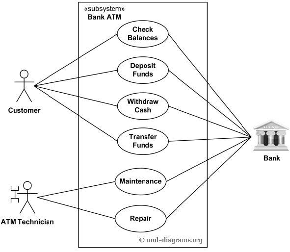 System Startup Use Case. The system is started up when the operator turns the operator switch to the "on" position. The operator will be asked to enter the amount of money currently in the cash dispenser, and a connection to the bank will be established. Then the servicing of customers can begin. [ Interaction Diagram ] Bank ATM UML use case diagram examples. Purpose: Describe use cases that an automated teller machine (ATM) or the automatic banking machine (ABM) provides to the bank customers.. Summary: Customer uses a bank ATM to check balances of his/her bank accounts, deposit funds, withdraw cash and/or transfer funds (use cases).ATM Technician provides maintenance and repairs to the ATM.